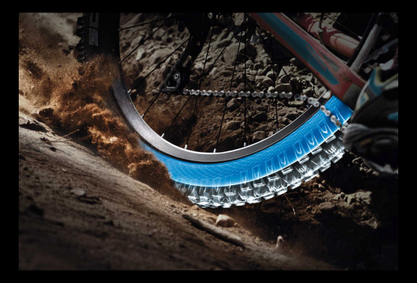 Nothing stays the same: In the future, air pressure can be controlled in the tire’s double chambers. In the outer chamber, the air pressure is extremely low – ideal for maximum off road performance. In the inner chamber, directly on the rim, there is high air pressure – even a very strong impact cannot dent the rim edge. At the same time, the inner high-pressure system secures the tire onto the rim. “Burping”, the dreaded loss of air at low pressure in conventional tubeless systems, is impossible.